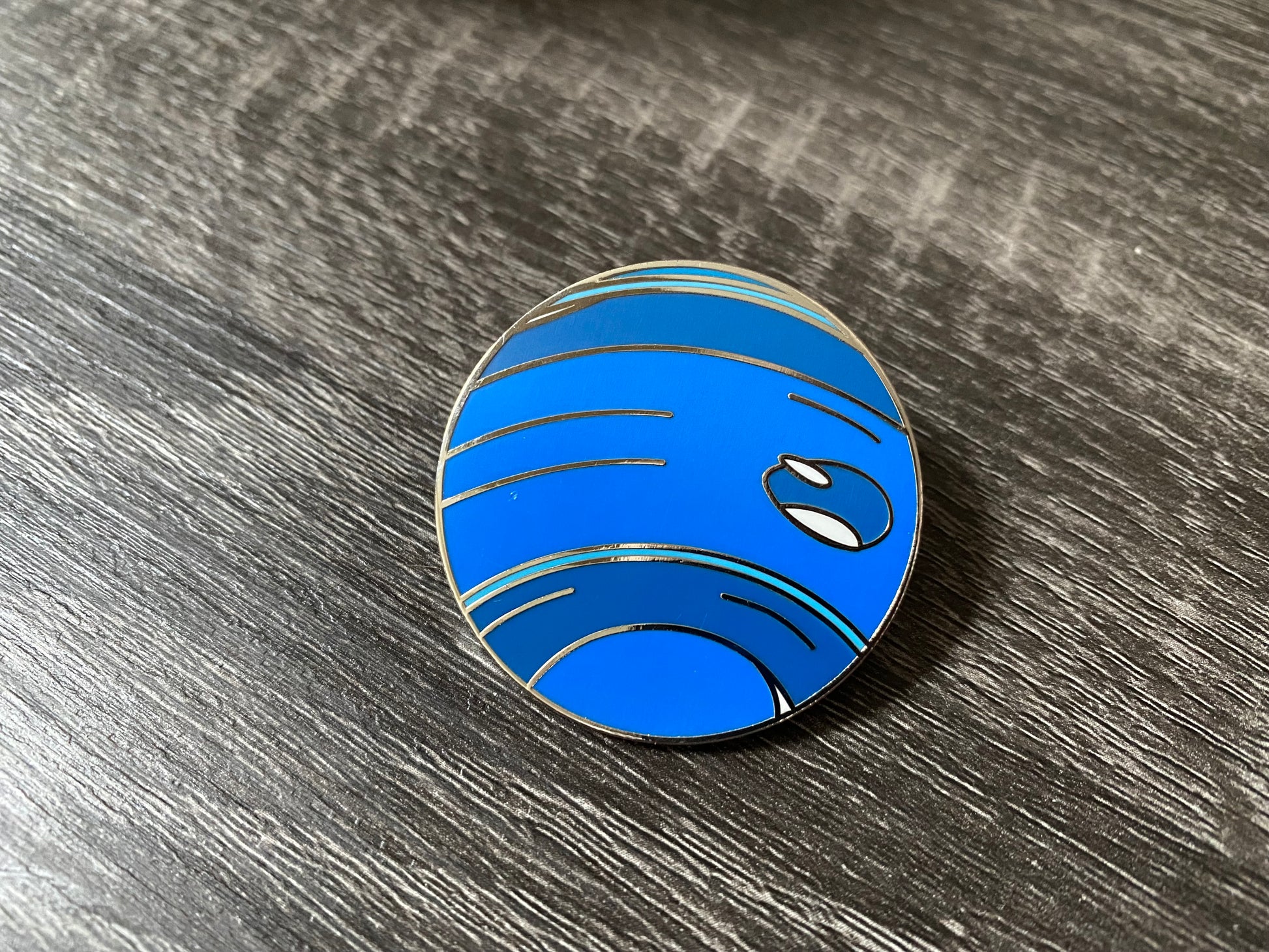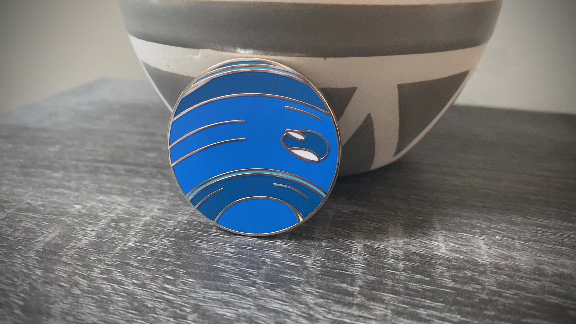 Neptune, the 8th planet from the Sun, and also a gas giant, represented in this beautiful 1.5" hard enamel pin! The planet image shows the a dark spot, a storm with extremely high winds, as seen by Hubble! When Voyager 2 flew by in 1989 there was a different storm, the Great Dark Spot, and the winds were measured to be up to 1,500 miles per hour! This pin is part of our planet series of hard enamel pins.
